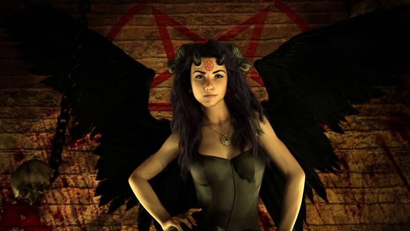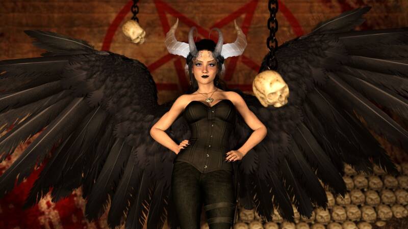 She was a tall woman with deep purple hair, pentacles where here irises should be eyes, and the whites of her eyes were a deep purple that looked nearly black. Her skin was blue with glowing white marks and she had a pair of massive black feathered wings. Three sets of frosted horns stuck out from her head, and she was dressed in nothing but black jeans and a corset.