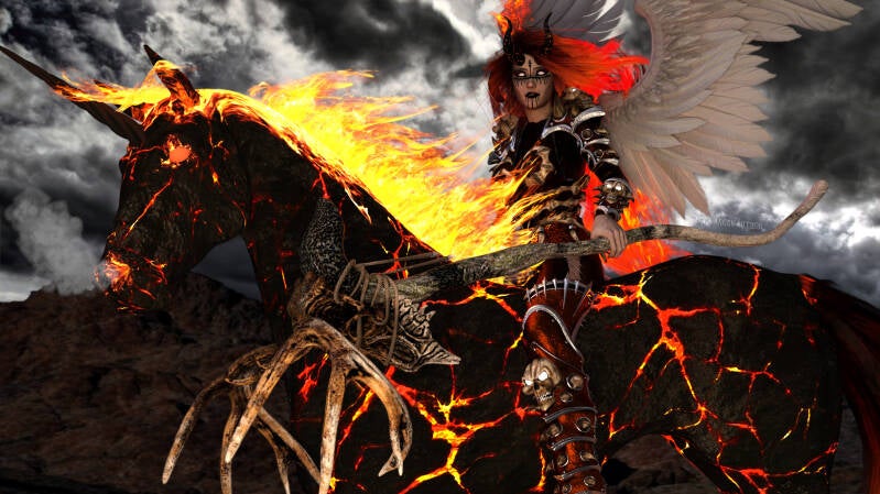 They say that Death rides a pale horse. They are wrong. The first time I saw Death, I was fifteen, an inexperienced boy, even though I was called a man. I thought I was hallucinating. She rode a horse whose skin burned like living coal with a single horn in the middle of its forehead and a flaming mane that matched its rider’s.