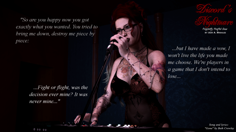 This piece is one that I have had made for several years. I am happy to finally have it see the light of day and give you a bit more incite into Discord and the Deadly Sirens: Discord, Havoc, and Chaos. They are not only Angels of Death, but three of the seven Angels of Music. Like each Angelic aspect effects each Angel differently, Discord’s Musical aspect is unique. When she sings, unless instructed to sing something specific, she sings “from her heart” which reveals her innermost thoughts, feelings, and so on. In the book, there is a scene where she is asked to do this in exchange for information for a case she is working for Lucifer.